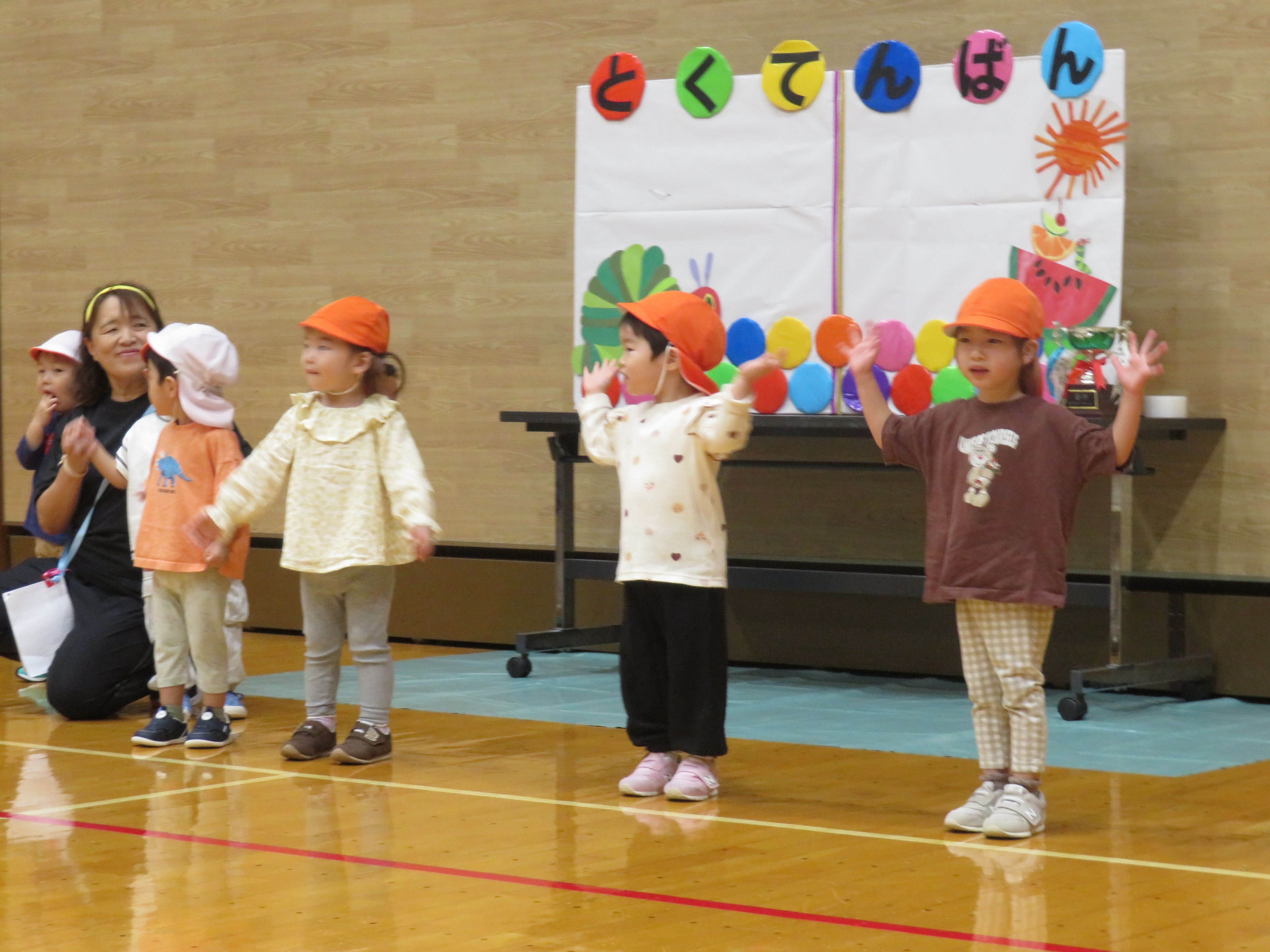 2歳児クラスは前に立ち『ゴーゴーゴー』の歌や体操を行いました。